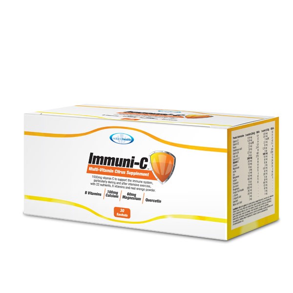 Immuni-C sachets are refreshing multi-vitamin health drinks that contain 1000mg vitamin C to support the immune system, particularly during and after intensive exercise, with 22 nutrients, 8 vitamins and real orange powder.